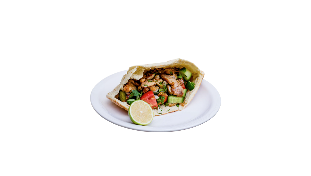 Chicken Doner. In Sipriot pita bread. Stuffed with cucumbers, tomatoes, onions and parsley