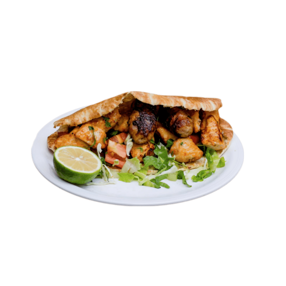 Chicken kebab and Sieftalia  In Sipriot pita bread. Stuffed with cucumbers, tomatoes, onions and parsley