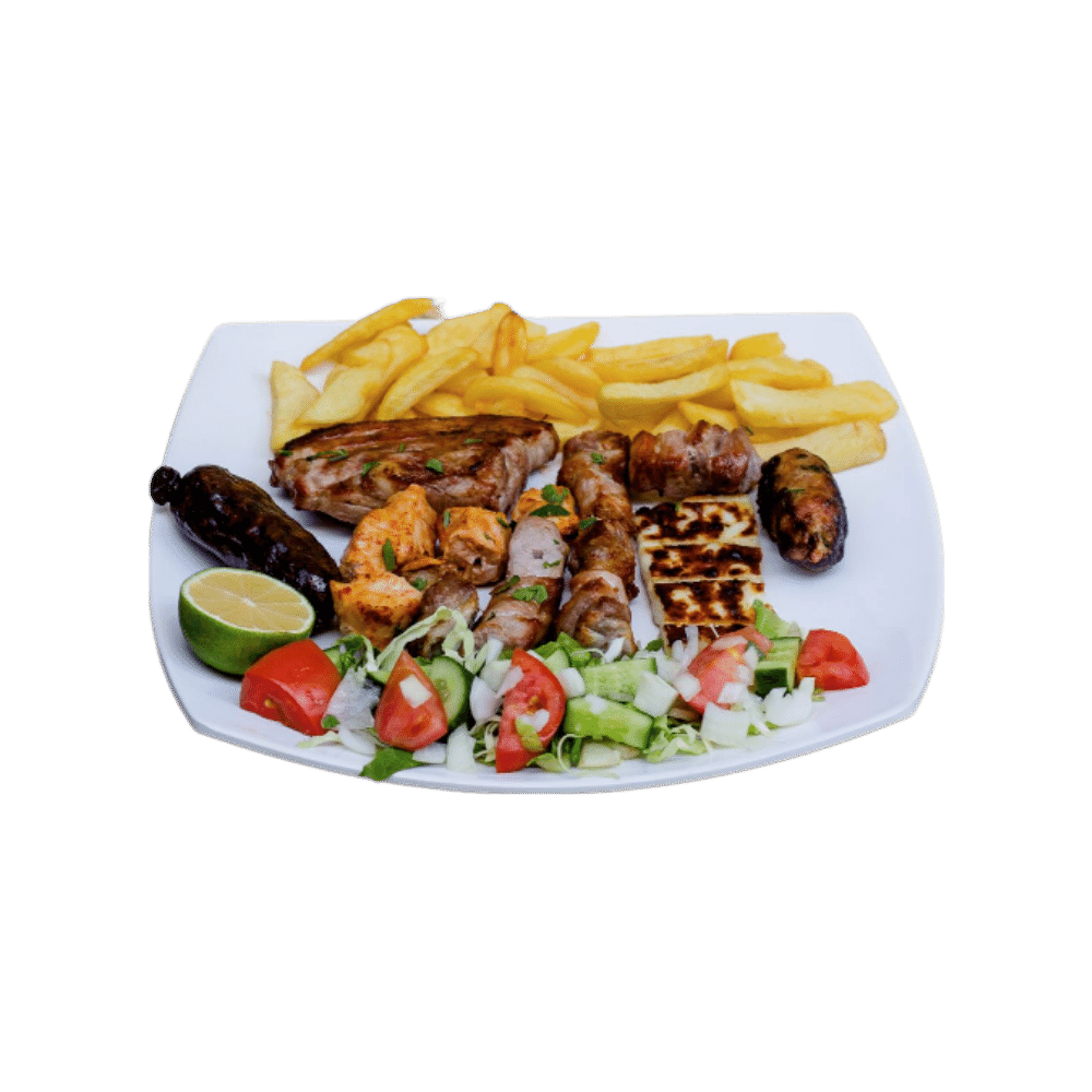 Mix grill for 1, accompanied by fries and a salad of lettuce, tomatoes, cucumbers, and onions