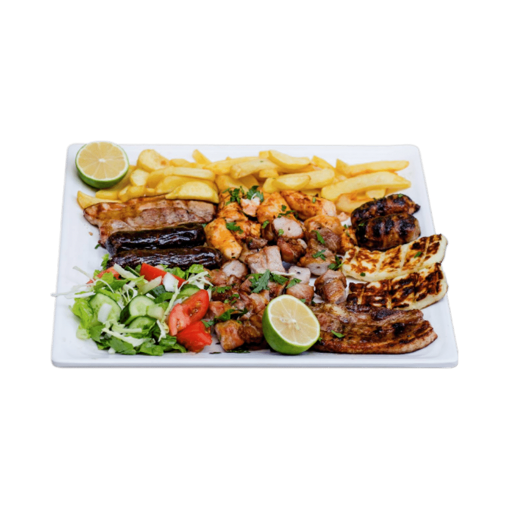 Mix grill for 2, accompanied by fries and a salad of lettuce, tomatoes, cucumbers, and onions