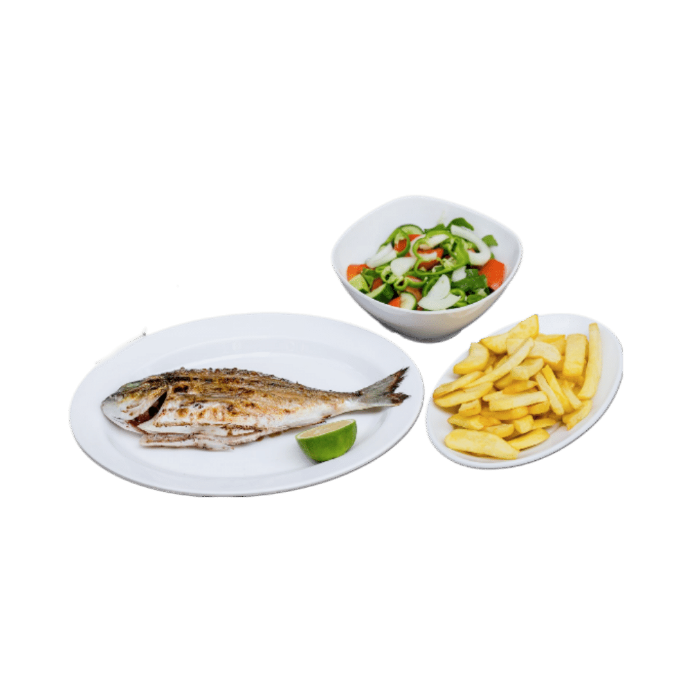Sea bream is accompanied by fries and a salad of lettuce, tomatoes, cucumbers, and onions